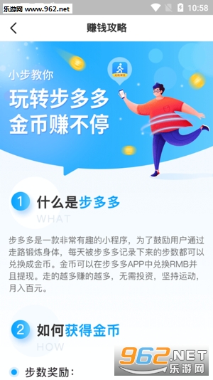 步多多以步数为基础,用户在每天的运动过程中,步数可以在APP上兑换金币,让你在轻松有趣的过程中边运动边赚钱,每天收获健康和红包。