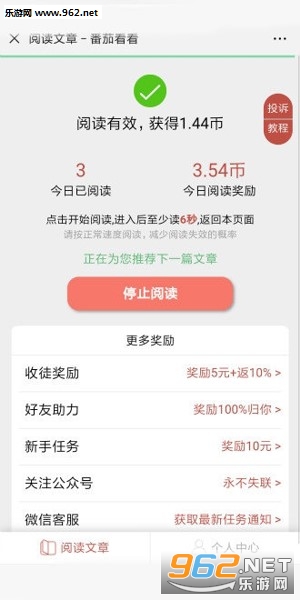 1.点击“开始阅读”会随机打开一篇文章,6秒后,手动返回,会自动进入下一篇文章,重复操作。