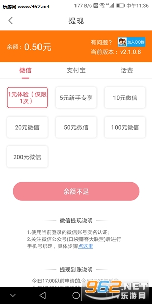 3、注册即送0.5元,满1元即可体验1次提现,正常新手5元提现,后续满10元可提现,支持和支付宝