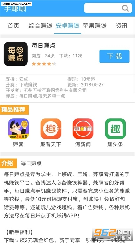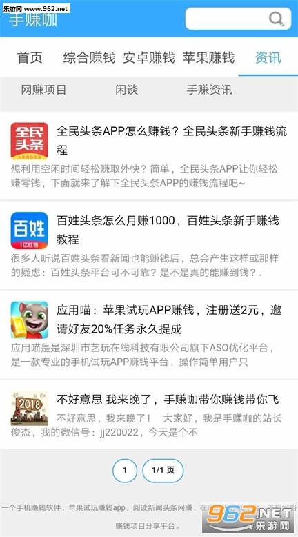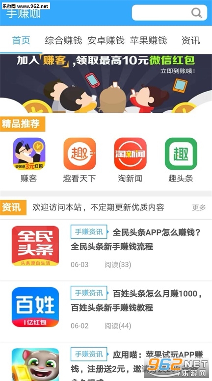 手赚咖 - 是一个手机赚钱聚合平台,更新手赚app快,内容全,在这里你可以发现有很多种类型的赚钱软件,如现在主流的(阅读赚钱,转发赚钱,试玩赚钱)等等,app仅1.9MB,占用内存非常小,目前平台上线不久,手赚数据还在完善,欢迎下载体验。