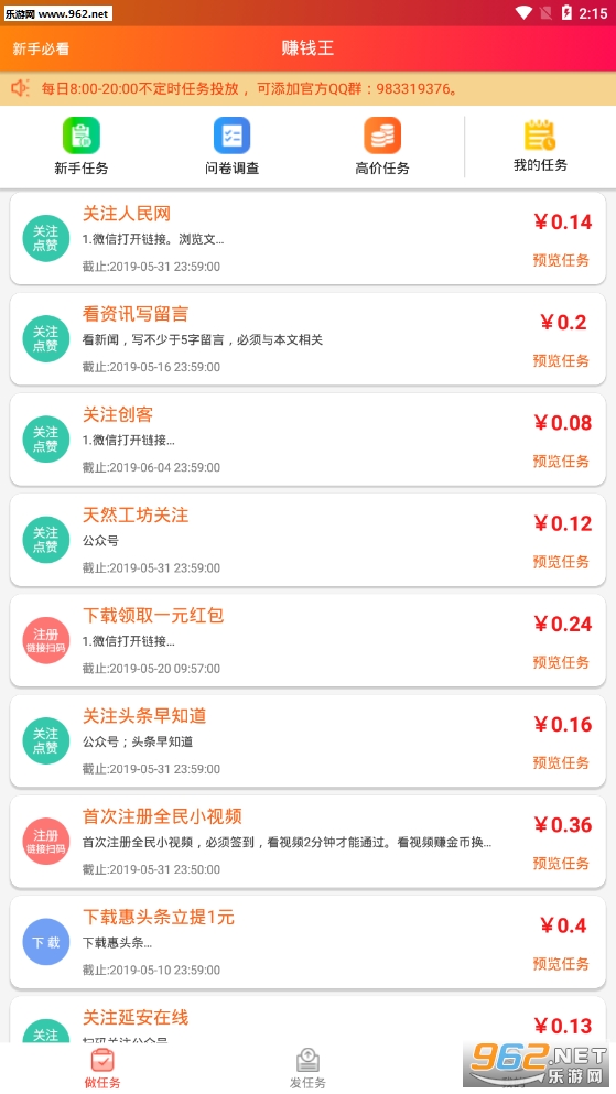 4.【赚钱平台】每天发布新任务,让你每天赚点,淘新闻赚钱,看有趣头条赚钱,调查问卷,小程序,公众号关注等多种微任务赚钱;