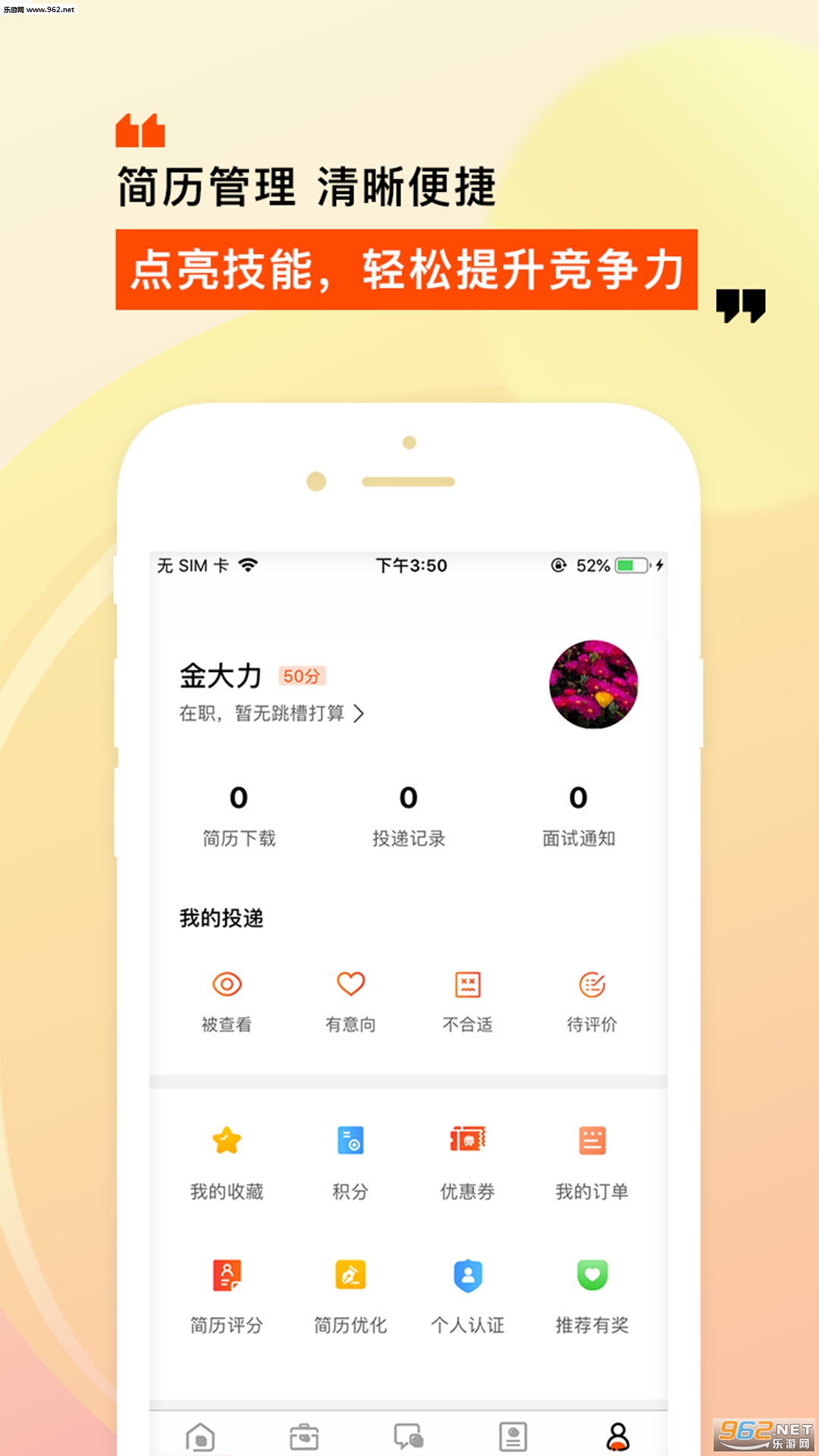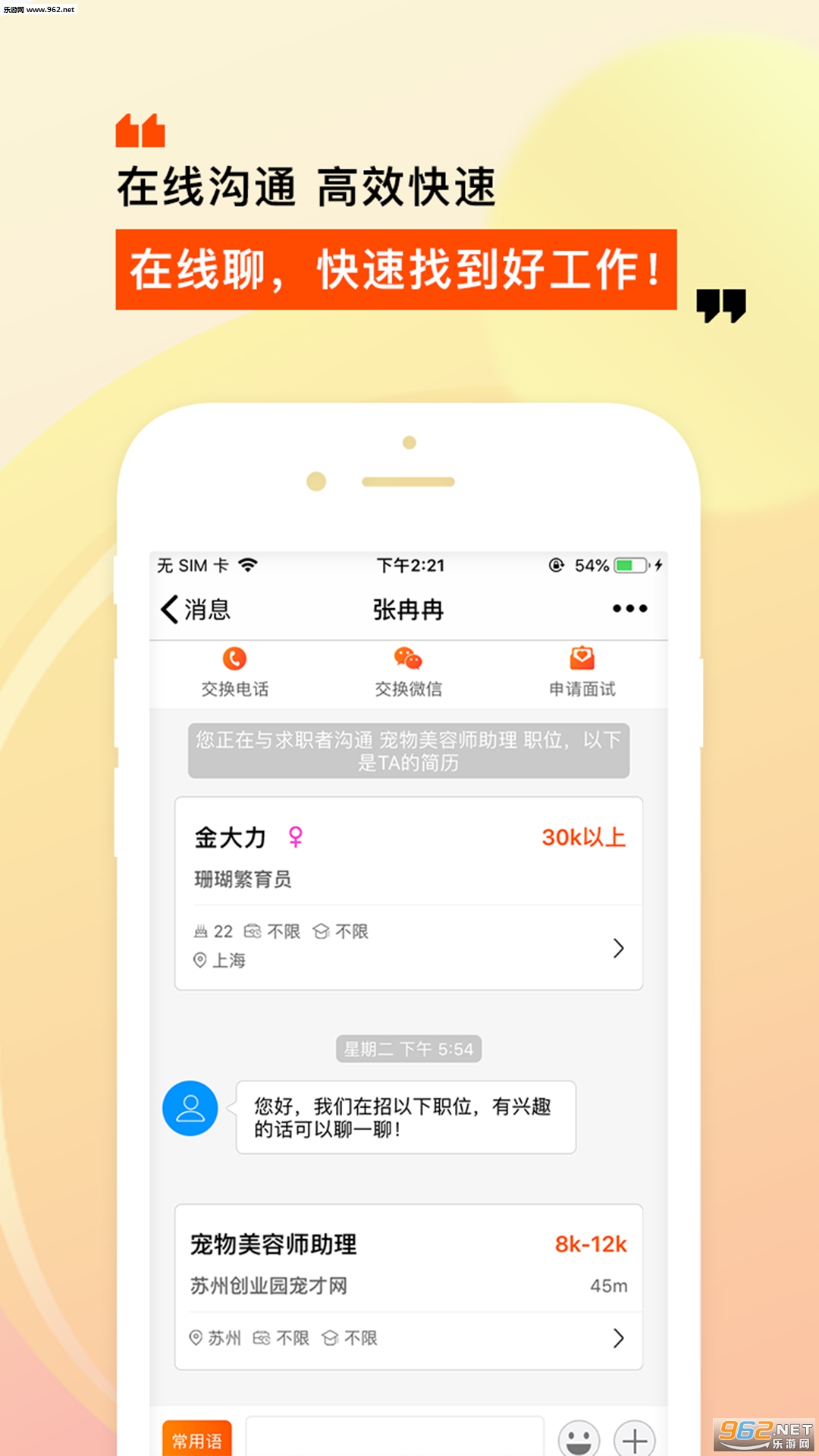 个人求职:创建、管理简历,任意搜索招聘信息,在线工作申请,接收面试通知;