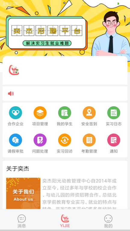 奕杰阳光-院校端APP是专注各大院校对实习生管理的移动端云服务信息系统,提供实习生就业招聘、实习日志、问题反馈、请假申请等功能,实现实习生实习安全管理和实习过程化的管理软件。