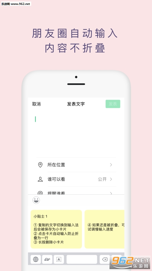 挺好用的一款朋友圈输入法工具,操作非常的简单,能够让你多次复制粘贴重要的信息,也能够让你的朋友圈文字不在被折叠,用起来更方便,玩朋友圈的小伙伴快来下载吧!
