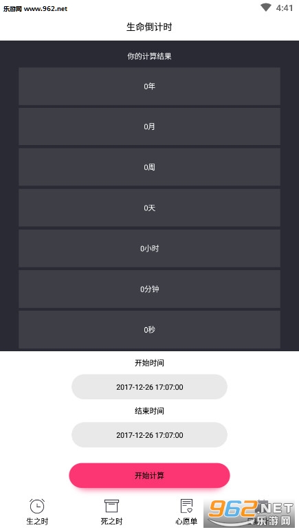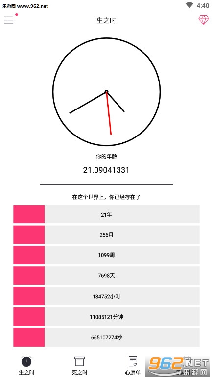 这是一款记录生、死、心愿的APP。有了它,你可以用生之时记录你的年龄,精确到秒,是生命计时器;用死之时预测寿命,是生命倒计时,记录你剩下的日子可以做多少次事;添加心愿单,记录你的心愿计划。