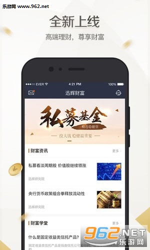 《迅辉财富》是一款专为高收入人群提供理财建议的app,能够根据用户的需求来匹配相应的理财,让你的财富得到比较好的收益,有需要的来下载吧。
