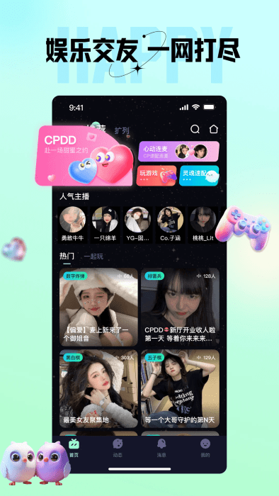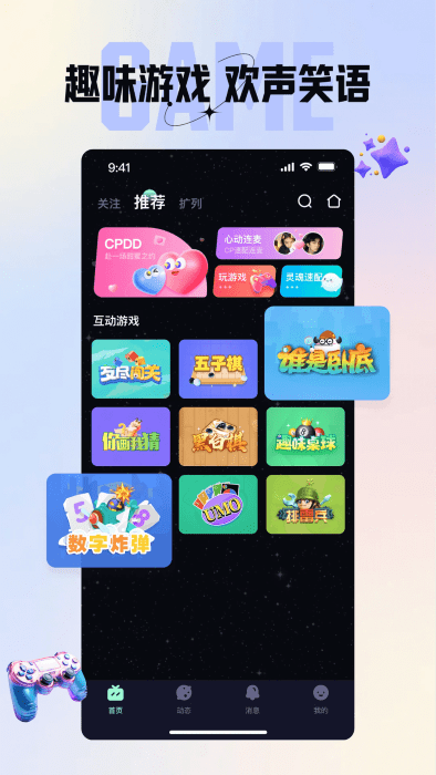平台内有谁是卧底、你画我猜、五子棋、友尽闯关等十几款互动小游戏,玩游戏交新朋友。