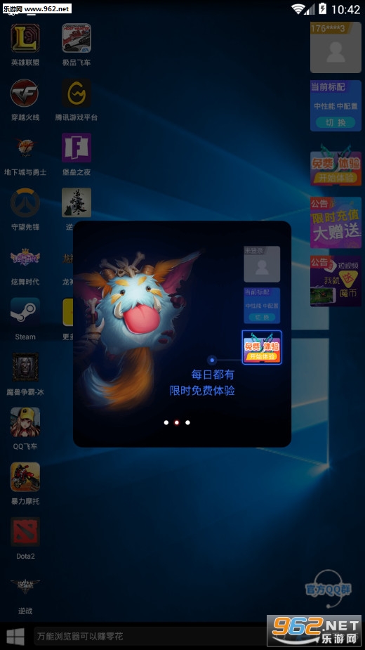 口袋网咖支持手机上使用一台虚拟电脑,根据用户需要选择不同配置的虚拟电脑。实现手机上玩大型PC游戏,目前支持绝大数的端游,比如飞车、英雄联盟、魔兽争霸、守望先锋,等。在高配的虚拟电脑下还能畅玩绝地求生(吃鸡)游戏。