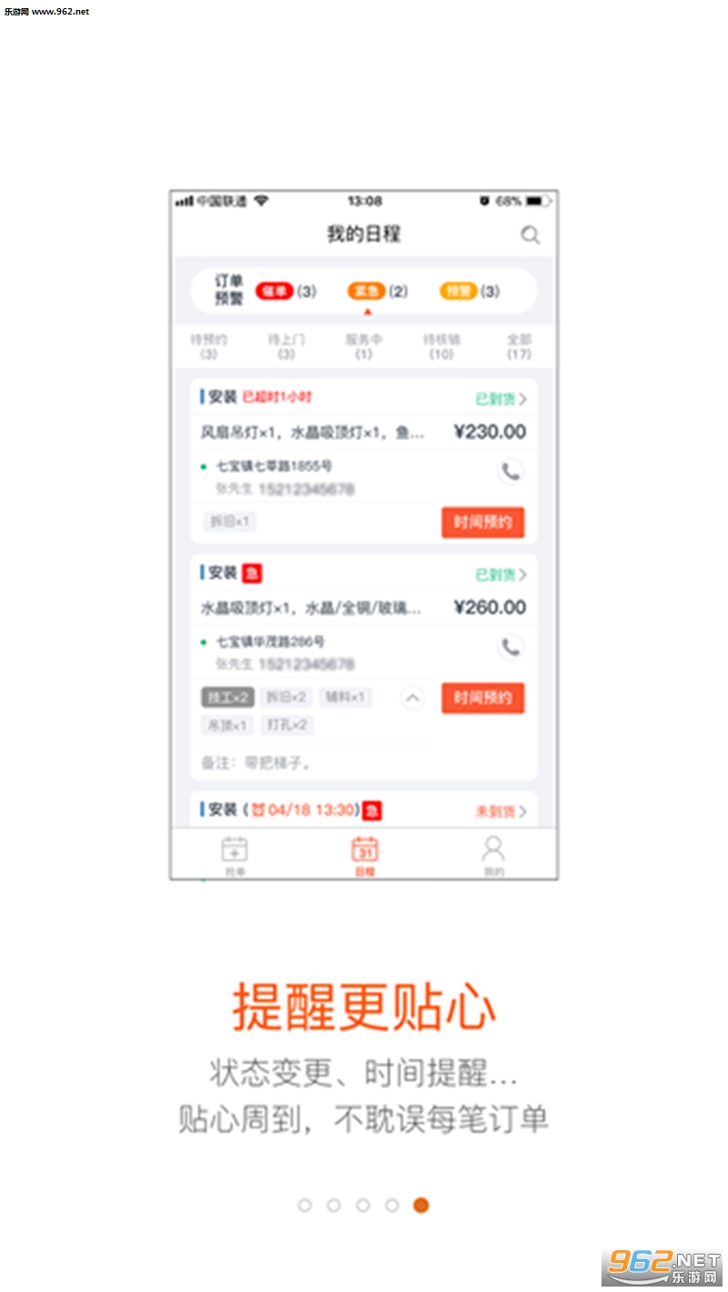 日程拥有待预约、待上门、服务中、待撤销、全部等功能,还设有订单预警:催单、紧急、预警等特色功能。
