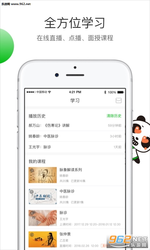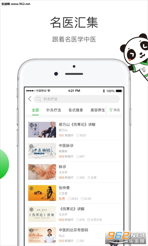 《熊猫中医app》是中医药的学习直播平台:学中医、懂中医、用中医,让中医服务于家庭、个人,让中国古代科学瑰宝为现代人类的健康保驾护航。