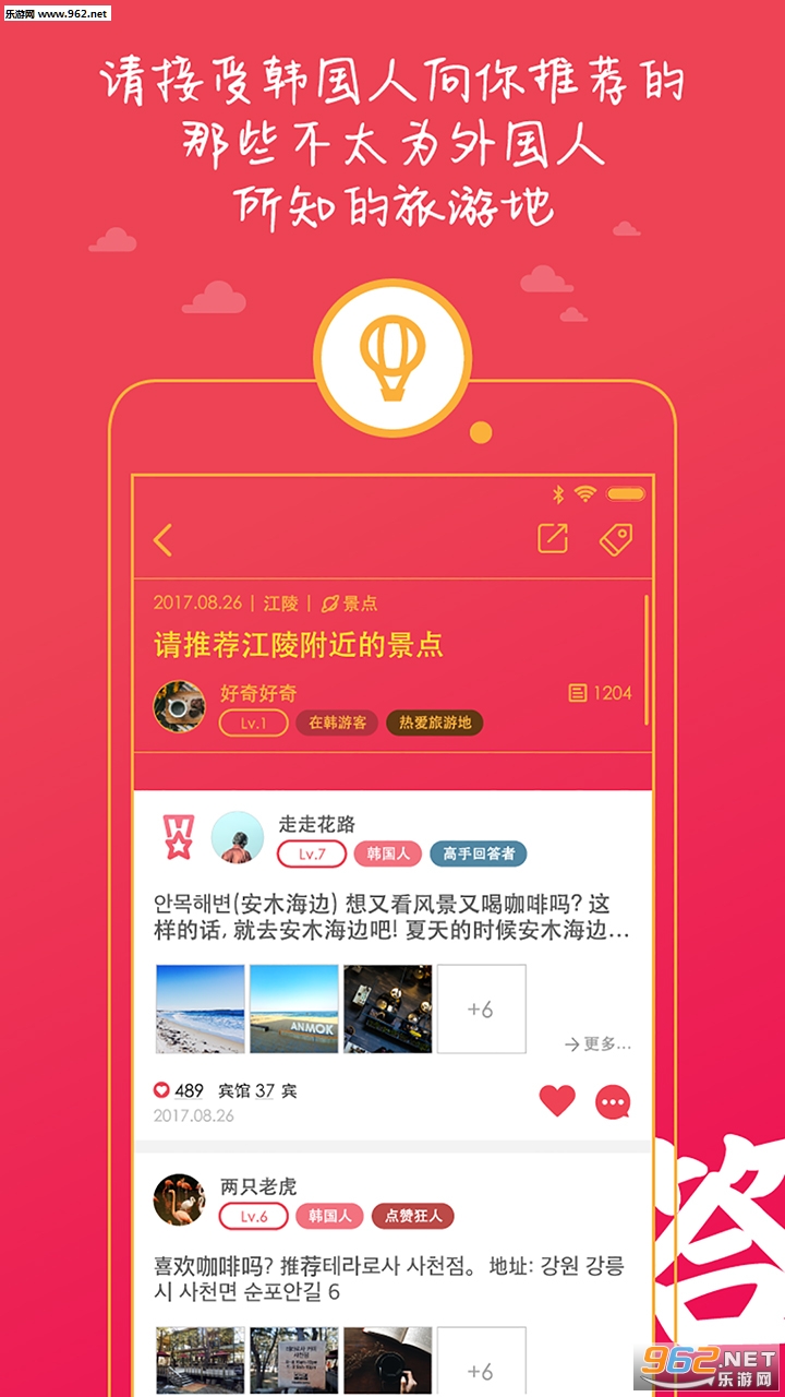韩国问我app是一款专为想去韩国旅游的用户打造的韩国旅游咨询问答平台,你可以在这里提问,也可以在这里帮助回答其他用户的问题,轻松搜寻包括旅游景点,火车路线,酒店住宿等资料。