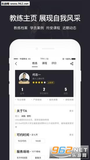我的主页、学员案例、教练动态、教练档案,用完整的工作履历和资质认证,用经历为自己背书,助力提高会员对自己更多的技能认知与了解。