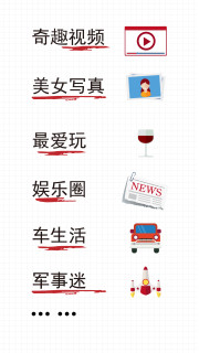 精彩内容大派送!内容超全、分类超详细的资讯APP在向你挥手,娱乐八卦、减肥妙招、撩妹宝典、男女情爱、宫廷秘事、星座命理、家装设计、美食菜谱、旅游攻略、社会热点……80多个精选频道,不信没有你的爱!15个视频二级分类全方位满足你的阅读喜好!