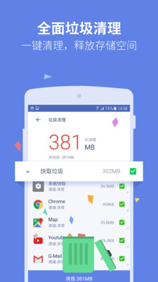 依靠强大的分析引擎,全盘清理垃圾档案、无用的快取、移除软体后的残留档案和资料夹,保持手机的干净整齐。