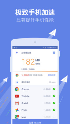 智慧关闭背景执行的应用程式,清理记忆体,加速系统运行。