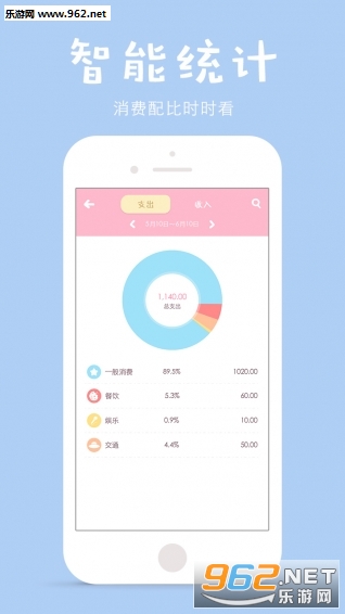 4、智能统计:清晰饼图图表展现各类支出收入,结余和汇总信息,账目心里更有底;