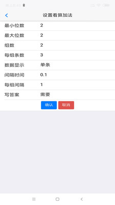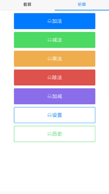 此应用包含了听算练习和看算练习,其中,听算练习和看算练习分别又包含了加法练习、减法练习、乘法练习、除法练习、加减练习。同是可以设置不同的参数,对不同阶段人员进行练习。对于练习后的数据,可以查看历史数据,重新练习等。