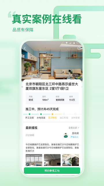 app装修现场实时汇报,智能化管理远程跟踪,施工进度了然于胸。管家式服务让您足不出户也能搞定装修。