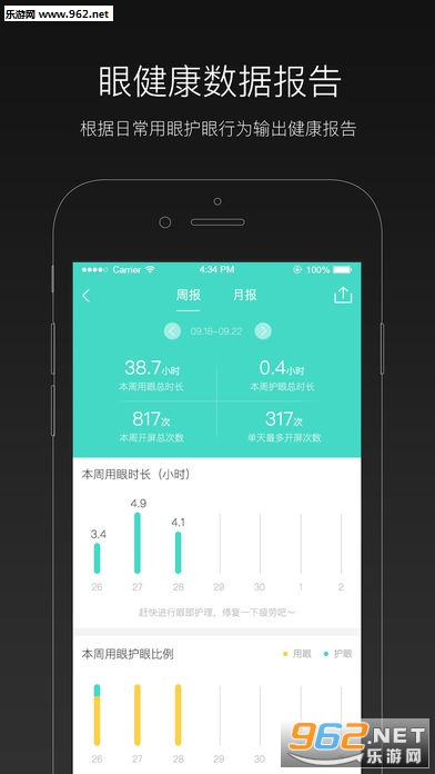 结合用户手机使用数据综合分析用户的眼健康状态,实时提醒用户进行护眼训练,快速形成健康的用眼习惯,及时修复眼睛疲劳保持眼睛健康美丽。