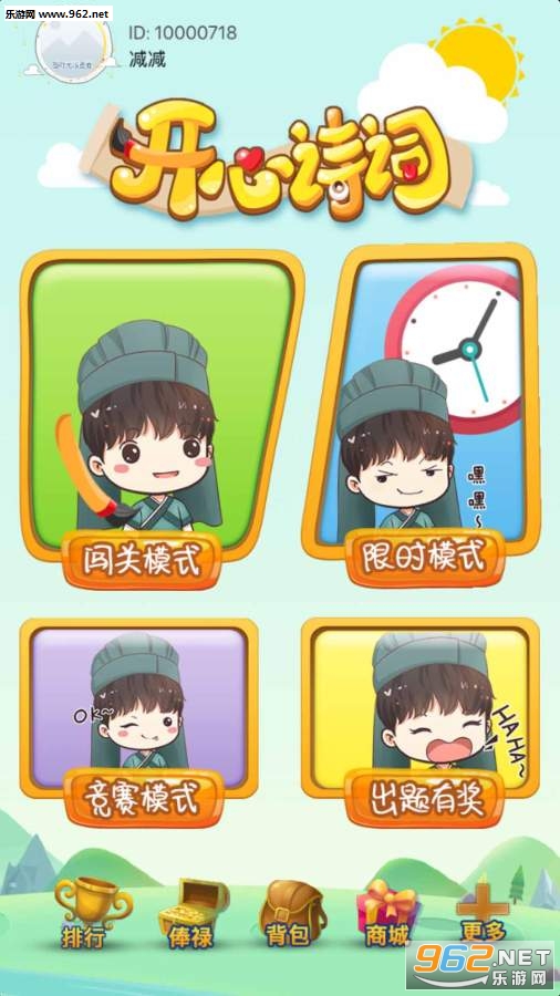 “万卷诗词在手,开心与你同行” ,“开心诗词”以海量的题库,多样性的出题组合,满足各层次诗词爱好者的全方位需求,其运作以趣味性为主。