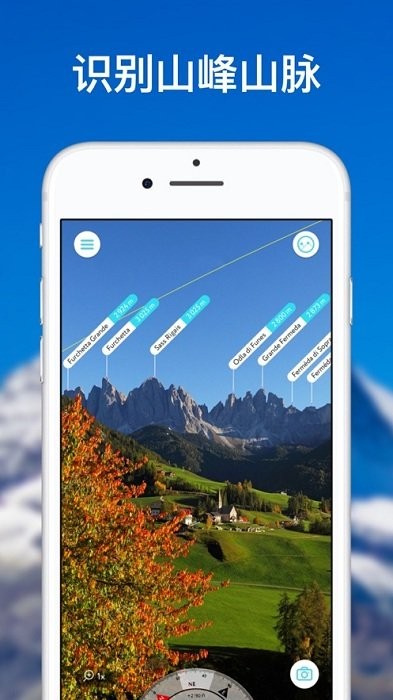 首先打开软件,授予拍摄定位权限,然后对准眼前的山脉或是将照片拍下来,软件就会自动识别,并且给出山脉的详细信息,如图,每座山峰的详细信息都会有