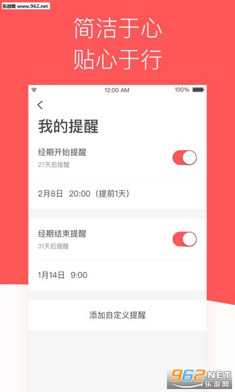【贴心提醒】您可以根据自己的需求设置经期开始前和经期结束时的提醒及其他自定义提醒