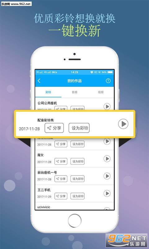 《配音彩铃秀app》是一款手机铃声应用,可以打造自己的专属铃声,无论是语音录音,还是你的歌声,都可以成为手机铃声,还支持彩铃服务,还有企业铃声制作,专业团队为你定制,三大合作商完美通用。