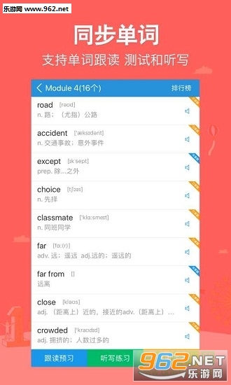 2.同步单词,支持单词跟读,测试和听写!
