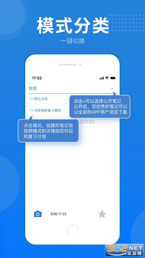 1、创建笔记:创建笔记的时候,选择最适合的记忆复习模式,应用会按照这个规律对您进行提醒,我们增加图片和文字的输入,方便您的选择。