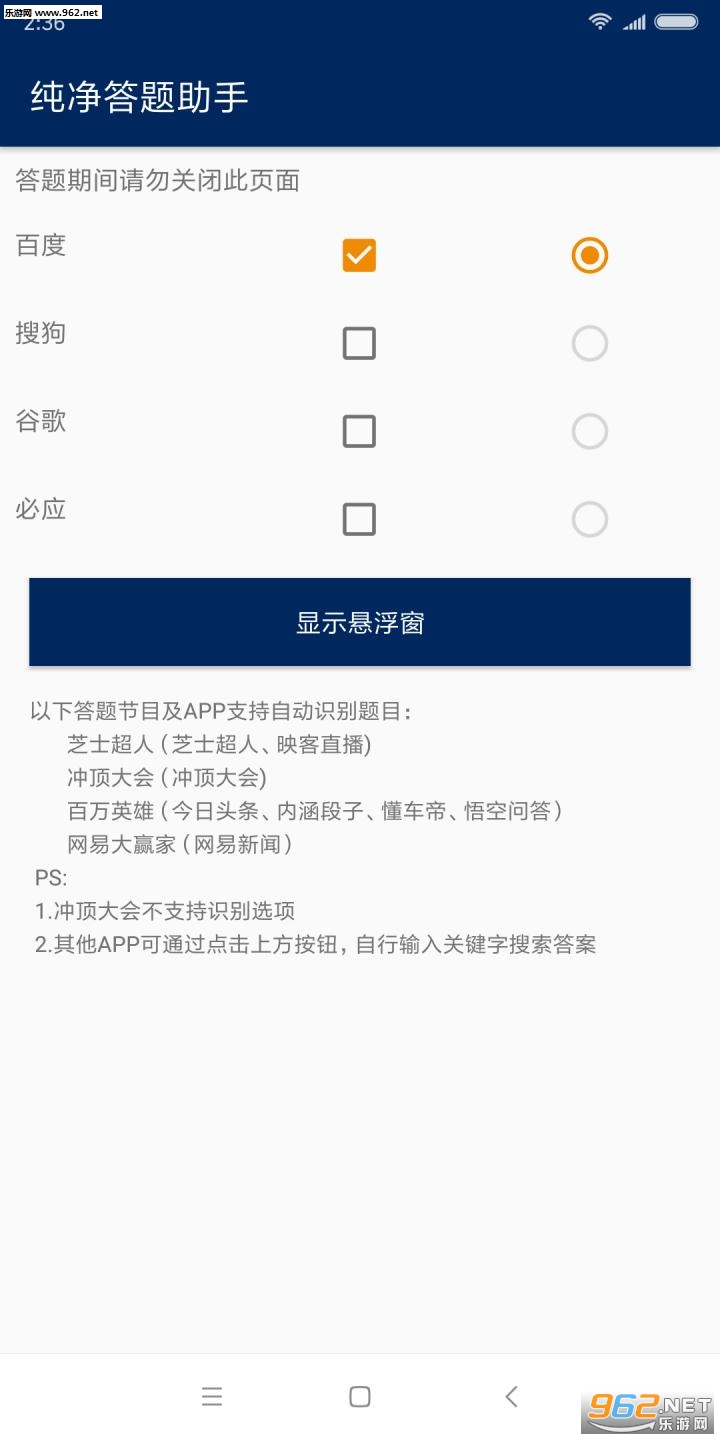 PS: 1.冲顶大会不支持识别选项 2.其他APP可通过点击上方按钮,自行输入关键字搜索答案