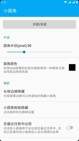 《小圆角》是一款可以帮助你将屏幕边沿边圆角的软件,帮助您将手机屏幕边沿变得圆润,手机屏幕变成椭圆型。