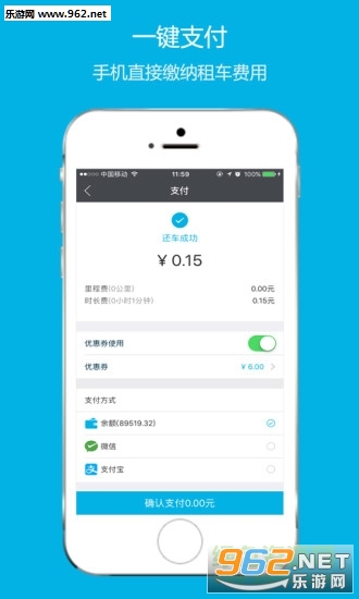 1.将租赁费用按分钟计算,没有起步价,大大减少了用户的费用,费用支付可通过支付宝、余额来支付。