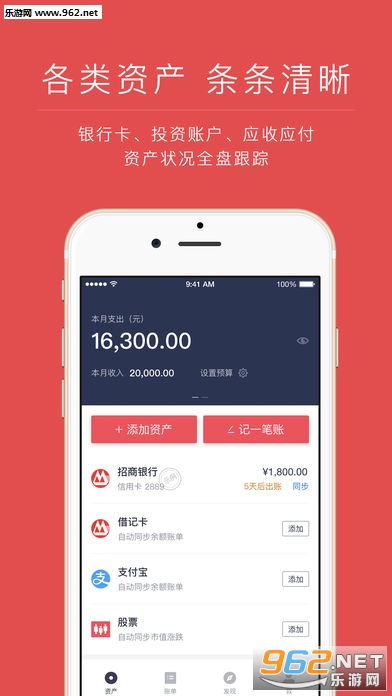 记录你的银行卡、股票、基金、互联网理财等各类资产,资产状态实时掌握;