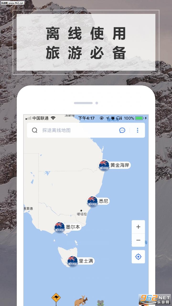 《澳大利亚地图中文版》是一款澳大利亚专业的地图导航应用。专为前往澳大利亚旅游,留学的人士打造,在这里,你可以清楚的看到各种全中文的景点,餐饮,购物,查找各种旅行的最佳路线,除此之外,还能记录你的旅行足迹,支持离线使用,非常的方便,快来下载吧!