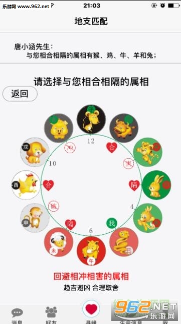 你只要准确输入自己的出生信息,系统将自动进入“寻缘”主页,独特的图文并茂 动画演示 语音播报方式,为你播报生命信息与你相生相合的用户供你筛选,你可以加生旺自己的人为好友,待通过后就可以与对方联系。左侧的“好友、消息”页面,能查看别人发给你的消息、喜欢你的人、自己创建朋友圈。