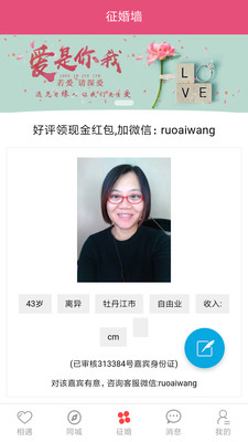 3、我的:个人详细信息的真实,会员信息都是经过严格的审核,可以在第一时间最真实的了解会员的个人情况。