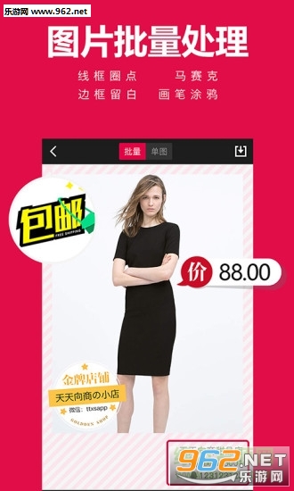 天天向商是时下热门的微商作图神器,从批量全屏水印到海报广告模板套用,满足微商所有的作图需求;各种朋友圈文案图片热点,带你轻松玩转朋友圈!全屏水印,微商水印,盗图宣传必备,改字体换颜色,支持全屏水印!上传logo!