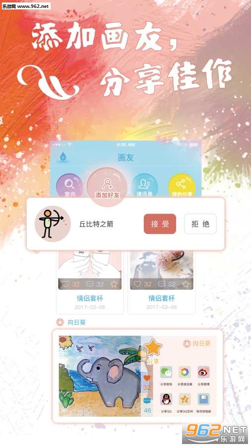3.以画会友:轻松转发第三方社交平台,自由创建专属的“画友圈”,独立的画作分享平台,让小伙伴们都来围观吧!