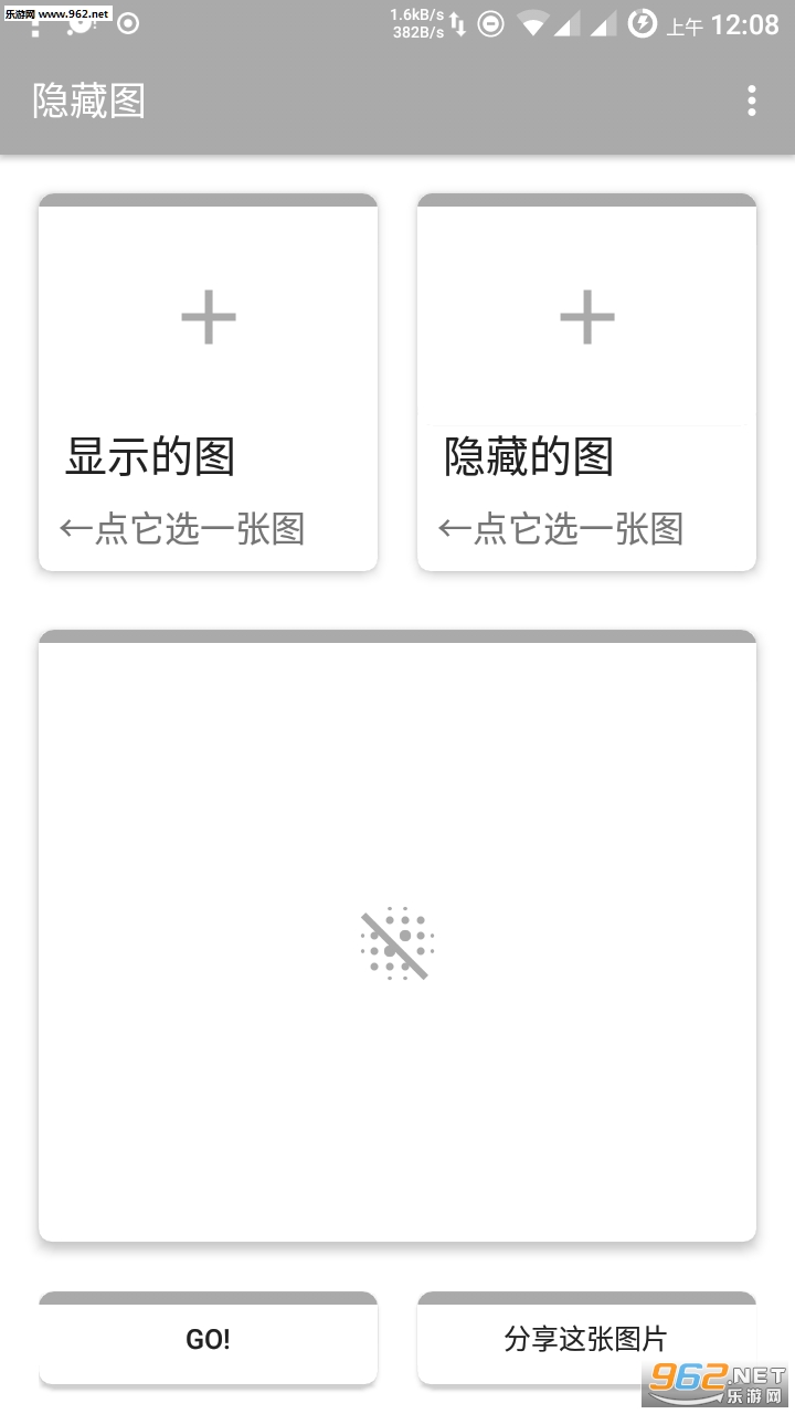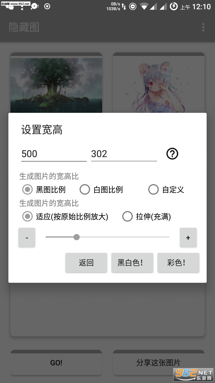 点击图片框选择从图库里两张图片,黑图就是表面的图,白图就是点击以后看到的图,然后Go!为新图片选择宽度和高度,合成的图片保存在内置存储的Pictures/BlackAndWhite文件夹下