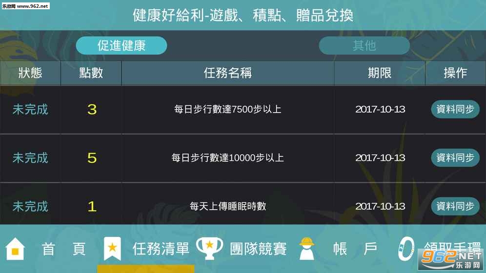 「团队竞赛」:以棋盘游戏为基础,总共分成6队竞赛,每队限额100人,欢迎大家揪伴共同加入。玩家可透过每日上传的步数换取掷骰子次数。游戏每月1日开团,并结算上月获得之健康点数(不列入周点数计算,仅并入「总点数」)