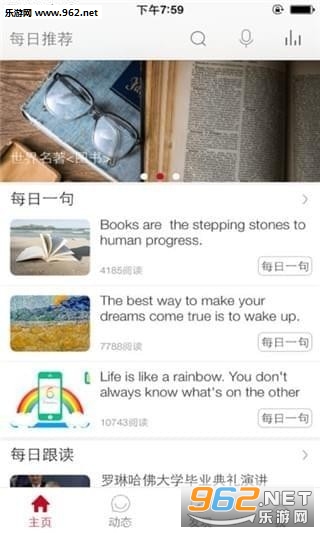 经典每日一句推荐,支持跟读和打分测试,支持语音和图片评论;