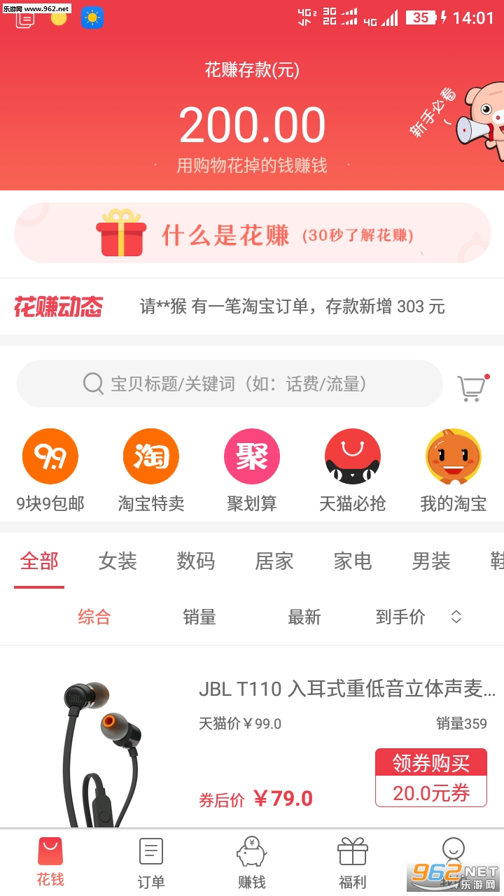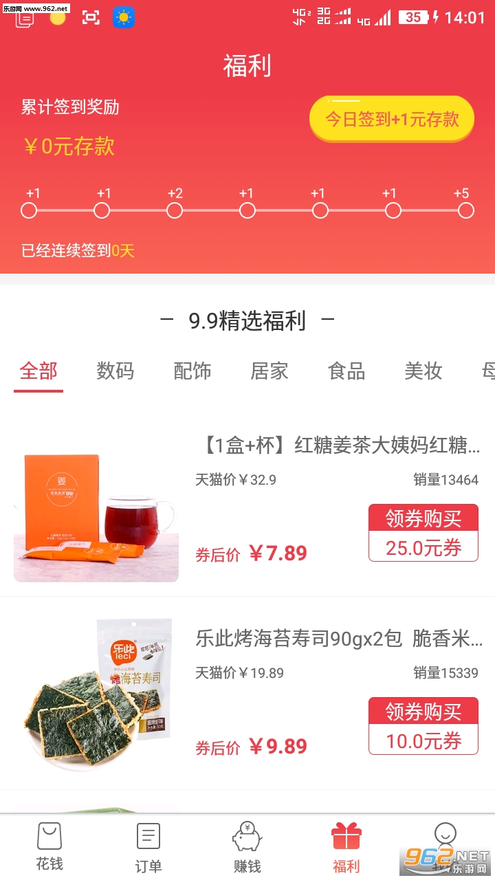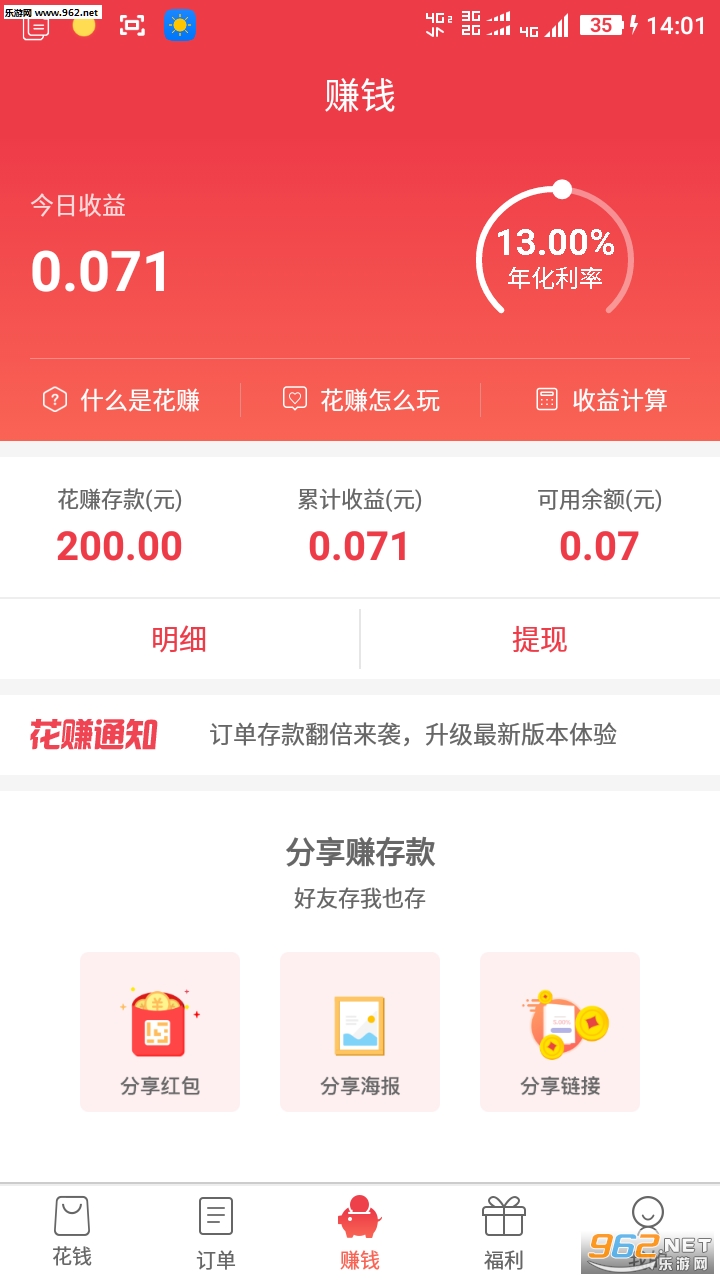 下载安装后,使用登陆即可以领取200元存款,然后每天在“福利”页面签到可以存1元/天,也可以通过花赚到淘宝等电商平台购物增加存款。