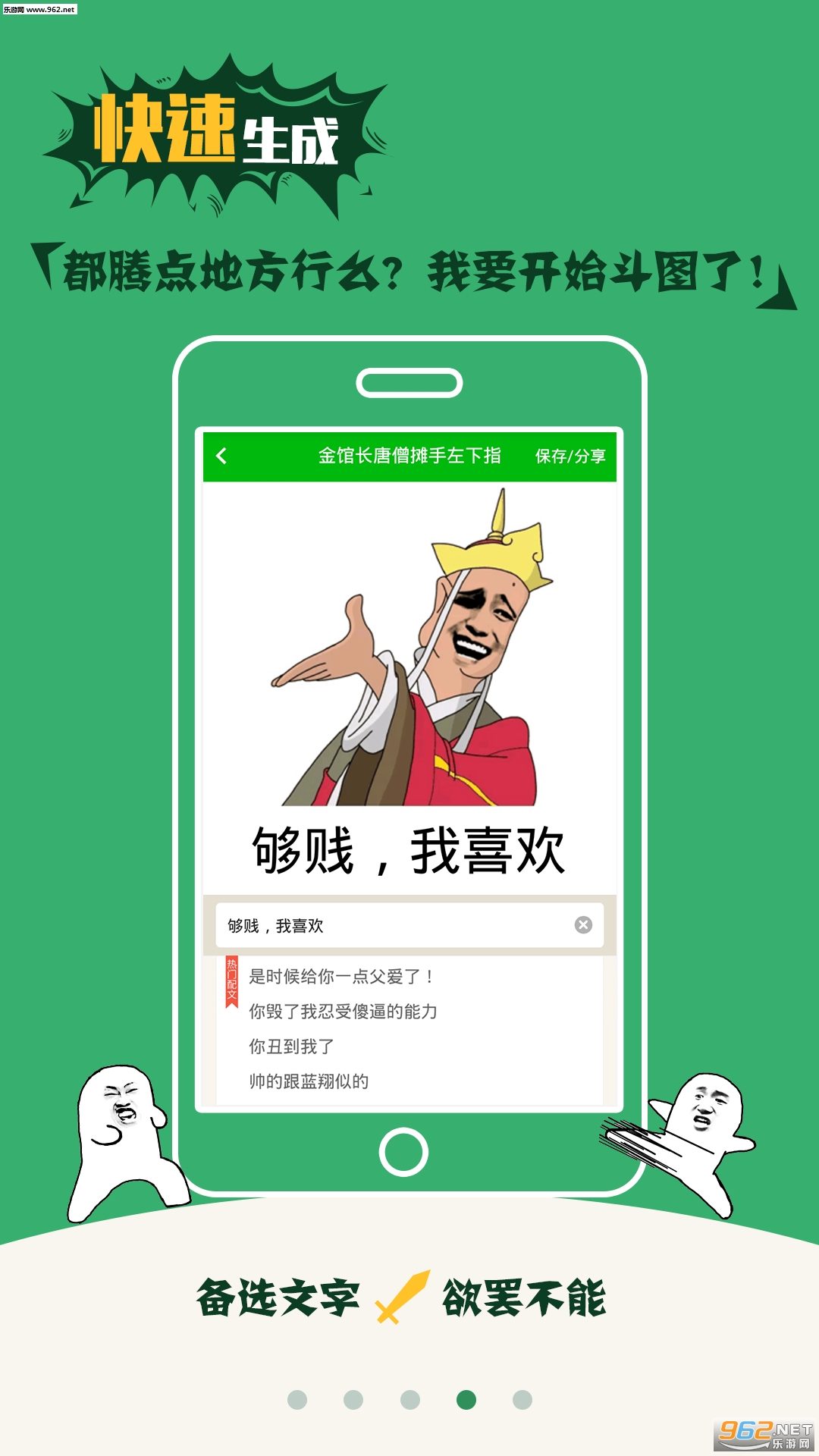 《斗图神器》是新一代表情包制作和收集神器,本版本增多了表情包的代表人物模板,细节化了表情包制作功能。