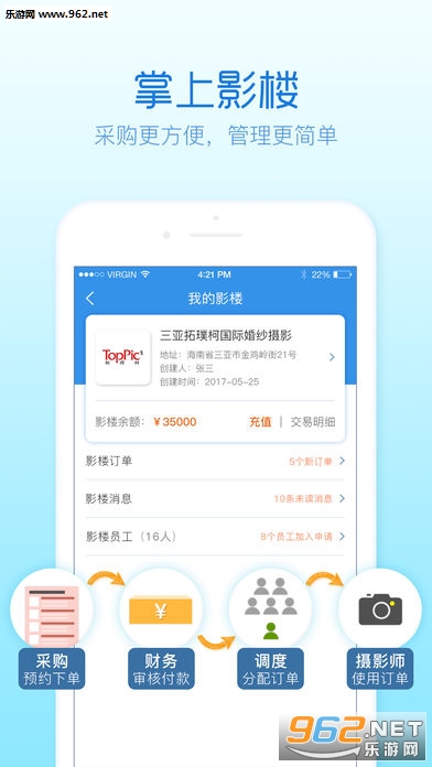 【影楼管理】线上管理影楼,订单从采购到使用,由不同角色的员工负责,优化实体影楼的工作流程,员工各司其职,令影楼订单管理更方便,效率翻倍。