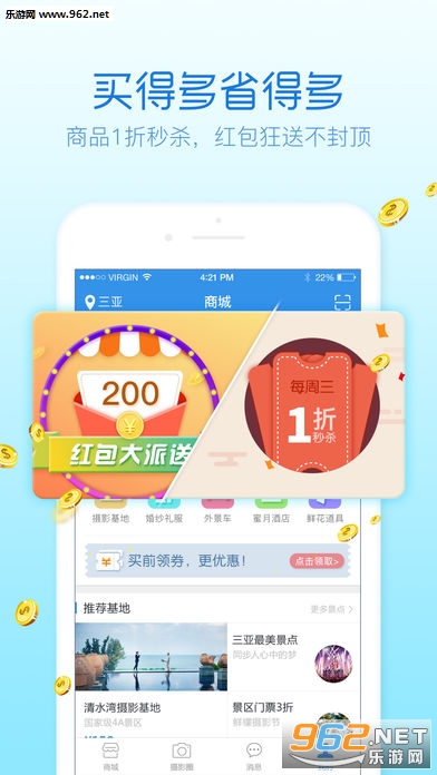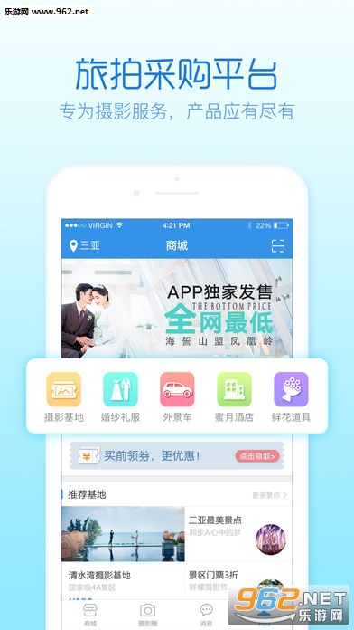 【实惠商城】为降低摄影师的拍摄成本,专售拍摄的景点门票、婚纱礼服租赁、拍摄外景车、酒店住宿、鲜花道具及制作相册相框等服务,价格优惠,操作便利,帮助摄影师获得最大的利润。