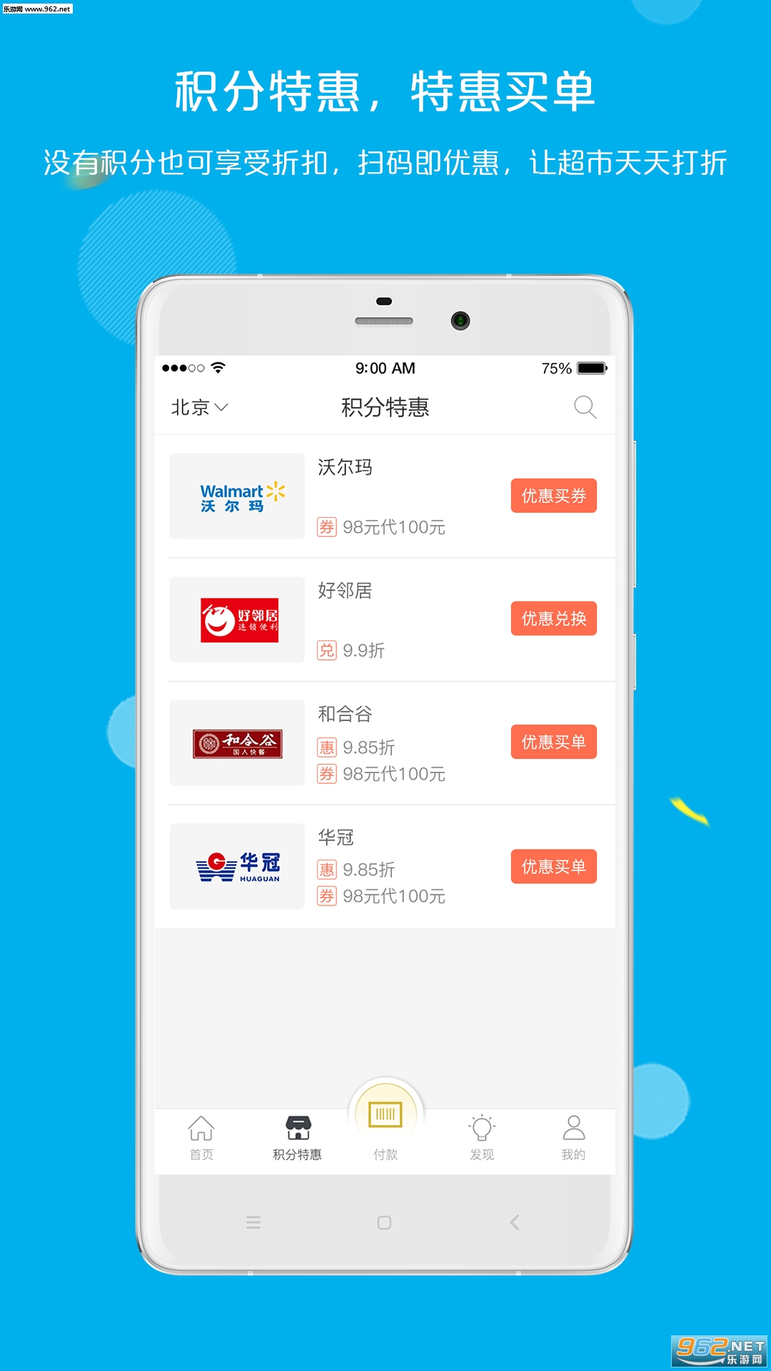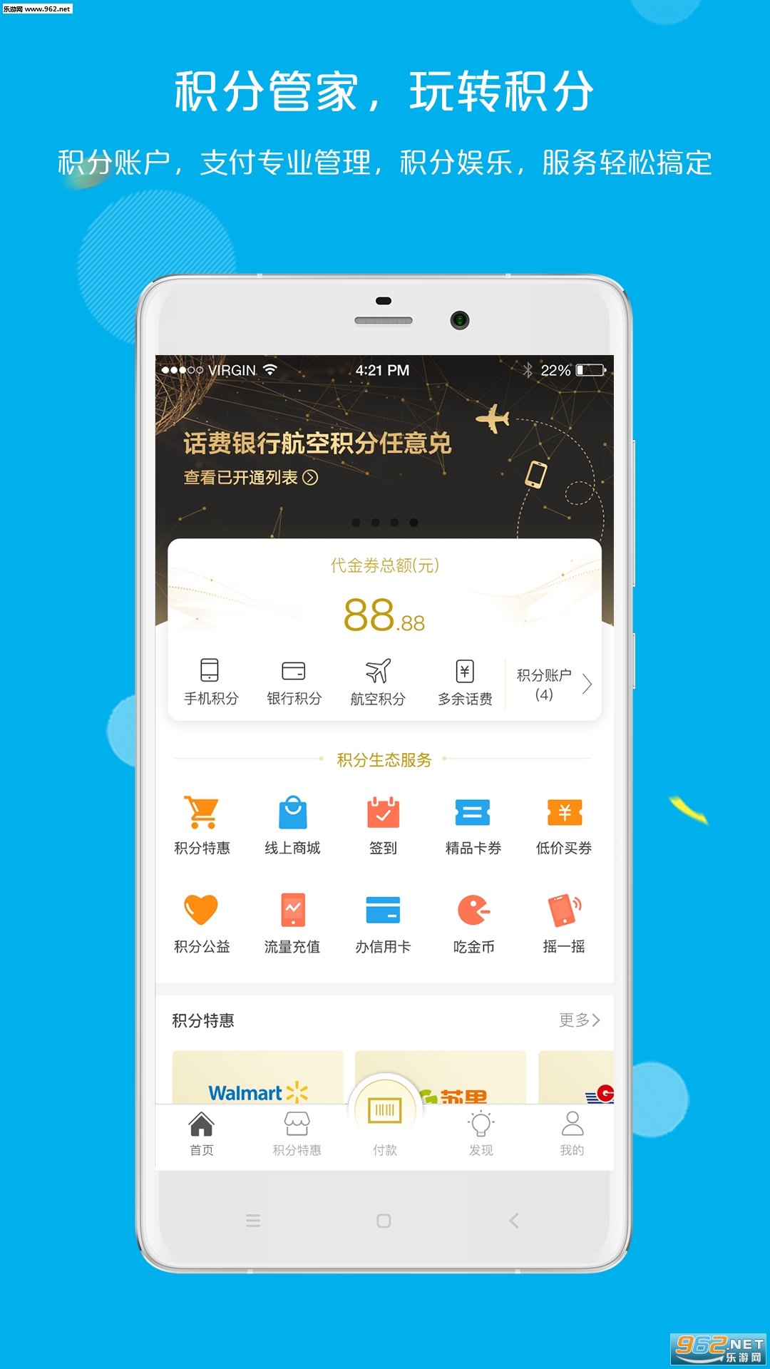 积分购物,就用积分购。支持各大超市、便利店、快餐店扫码消费,更能天天享折扣,是您日常省钱的小管家。目前已支持中国移动、中国电信、中国联通、工商银行、民生银行、邮储银行、东方航空、平安万里通等40多个平台的积分兑换,支持在沃尔玛、苏果、肯德基、必胜客、苏宁等50多个品牌3万余门店消费。