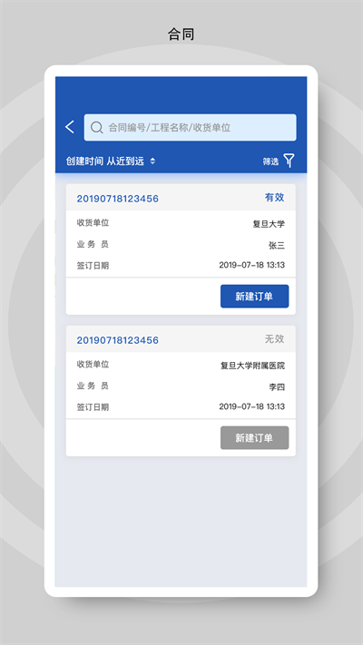 3、通过合同搜索功能输入订单编号或项目名称,查看订单进度及历史记录,导出数据或分享给同事。
