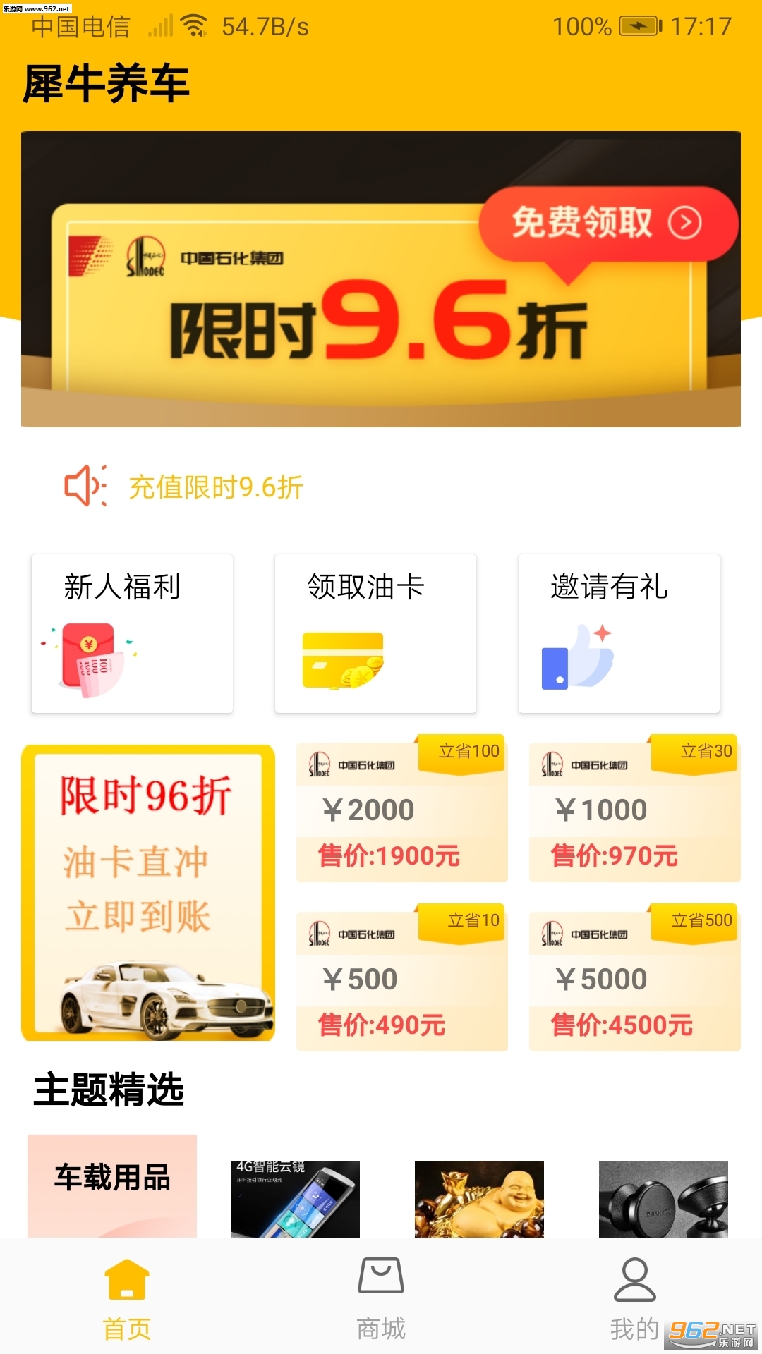 犀牛养车,这是一款十分便捷手机油卡充值服务app,充值优惠多多,即充即到账,无须担心资金问题,注册即送新人大礼包,邀请有礼,邀请好友即可获得大礼包,限时9.6折,免费领取中石化加油卡,还提供汽车周边商品的购买,有需要的快来体验吧。