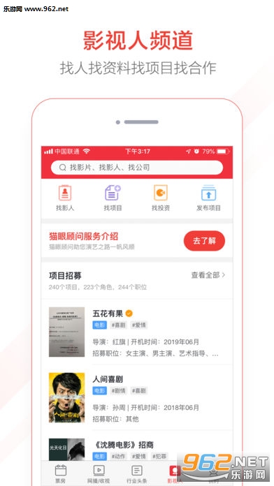 找合作:海量剧组入驻,与剧组真实对接,双方直接沟通合作意向,提高影视剧制作效率,业内精英工作 档期无缝衔接;