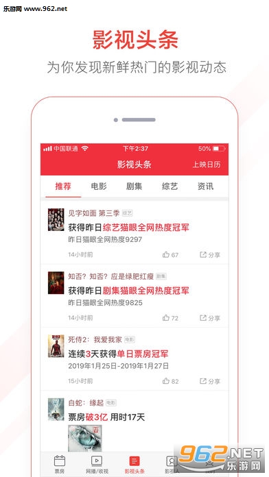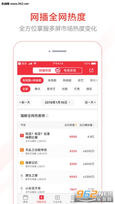 《猫眼专业版》是一款非常好用的电影资讯软件,软件中有着各种各样实用的功能,如果你关注电影或者是电影行业的人员,这款软件可以给你带来许多的帮助,实时更新的票房信息,全网热度,掌握更多的信息,赶快下载体验吧!